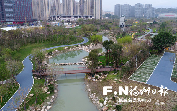 作为晋安东区水系颇具特色的河道之一,凤坂一支河贯穿了晋安区3个大公园(牛岗山公园、鹤林生态公园、晋安湖公园),已建成的850米段把海绵和生态理念充分融入,采用了水土保护毯生态驳岸(河道旁种植梭鱼草、鸢尾、菖蒲、千屈菜、美人蕉等水生植物),河道宽为5.5米至13米,眼下已变身公园的招牌景观之一。