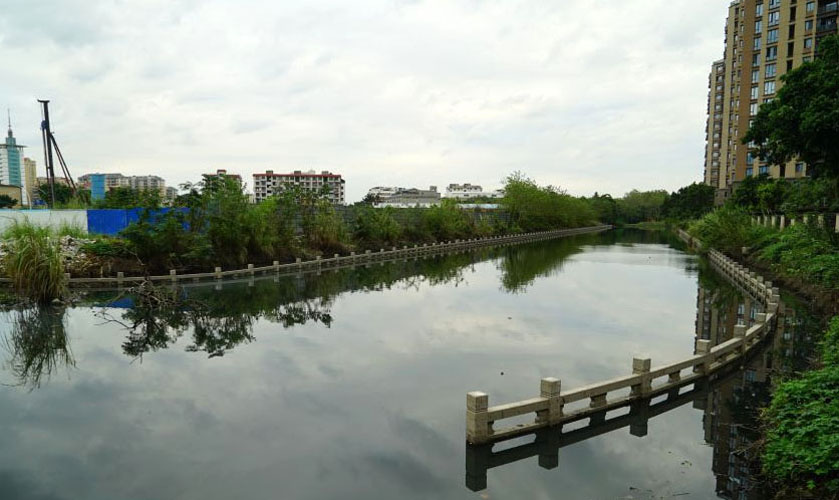 仓山跃进河黑臭如墨,河边新修的石栏杆泡在污水中