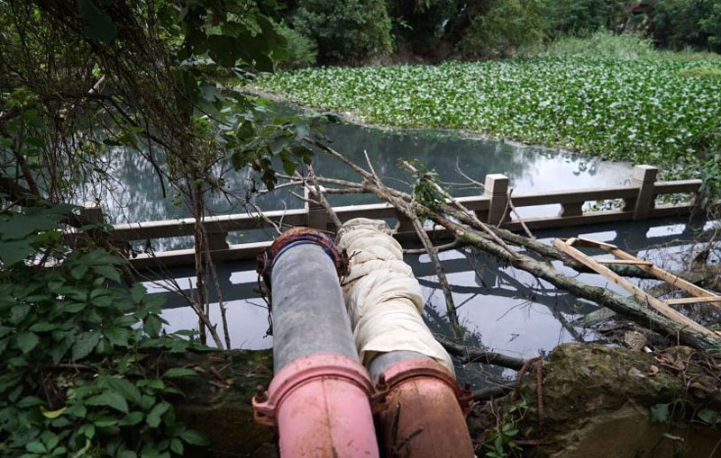 沿着河道一侧走进一小区,只见绿化建设十分漂亮,但空气中弥漫的臭味却令人没了赏景的兴致。在该小区3号楼和5号楼间有一处污水槽,两条水管从污水槽直接穿过围墙通向跃进河。记者在现场观察,二三十分钟后,污水槽内的水泵开始运作,将污水直接排到跃进河中。