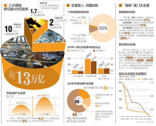 在此后的两会记者会上,环保部部长陈吉宁表示,环保是当前和今后拉动经济增长的一个重要推动力,未来几年环保投资需求非常大,在8万亿-10万亿元,而且这项投资没有重复建设,可以长期受益。但中国过去三年来的环保投资主要依靠政府投资来解决,占比在30%-40%,这个市场还未完全打开,尚未带动社会资本进入。为此,国家将推动价格体制改革,并进一步开放市场,以PPP(政府与社会资本合作)模式推动环保市场的形成,提高环境治理效率。